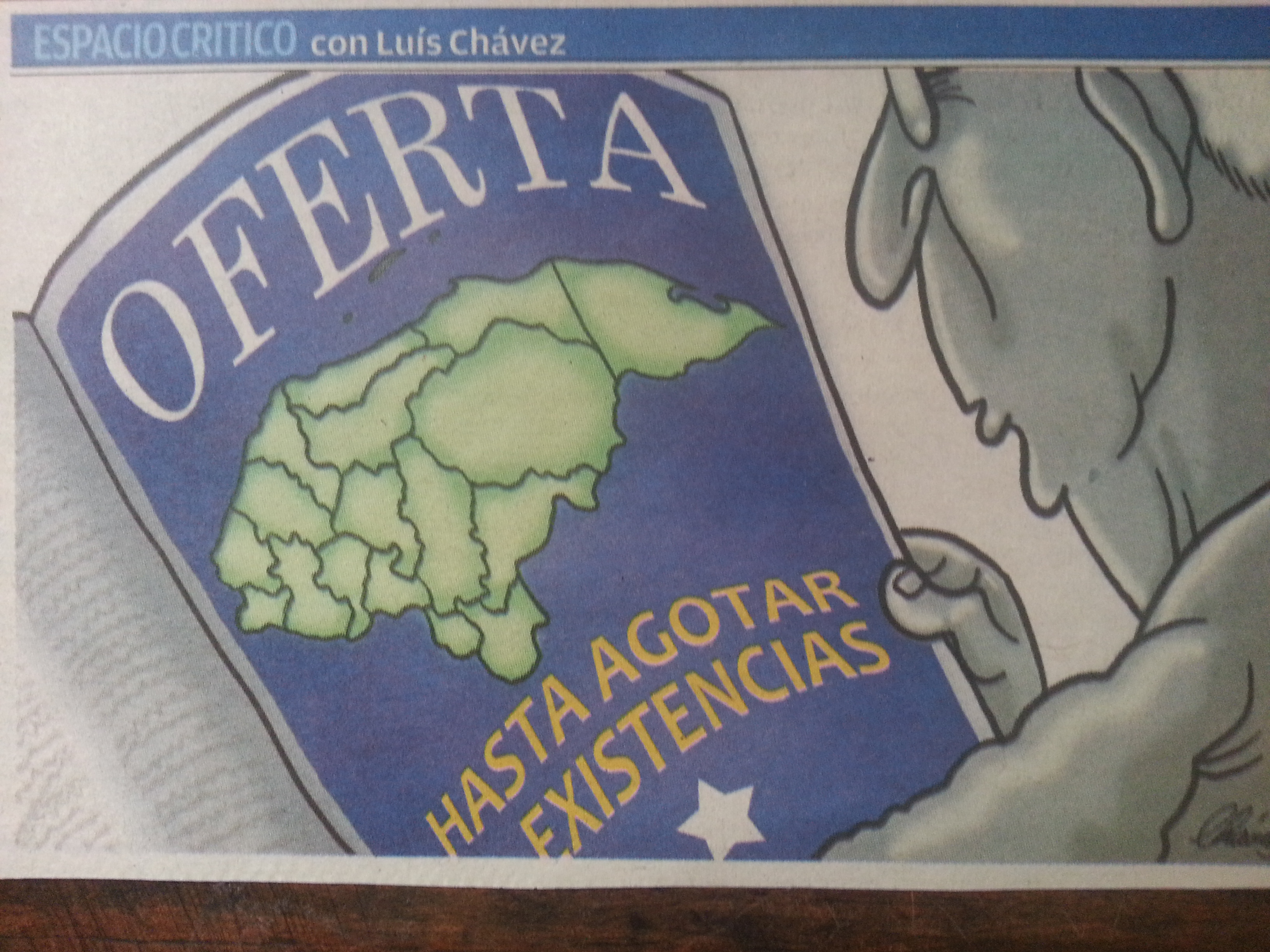 This cartoon, published in the July 31st issue of el Tiempo, refers to the current wave of liquidación in the Honduran government’s mad dash to sell off land, highways, and drilling rights. It reads: